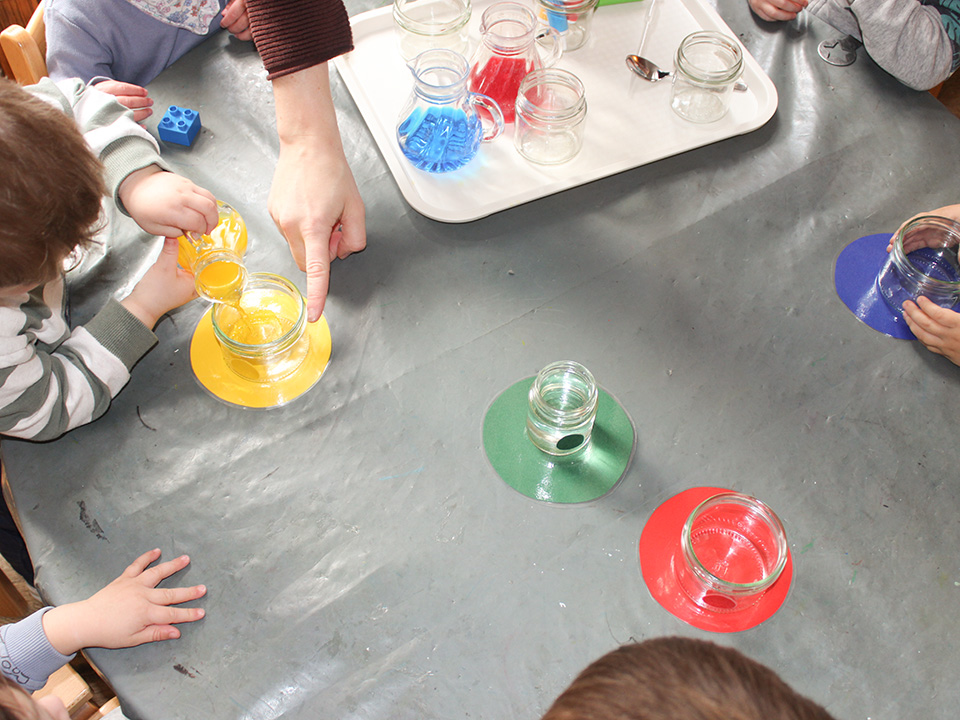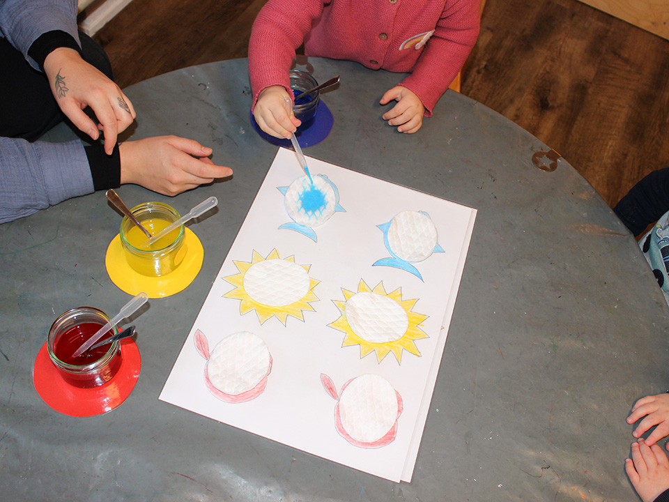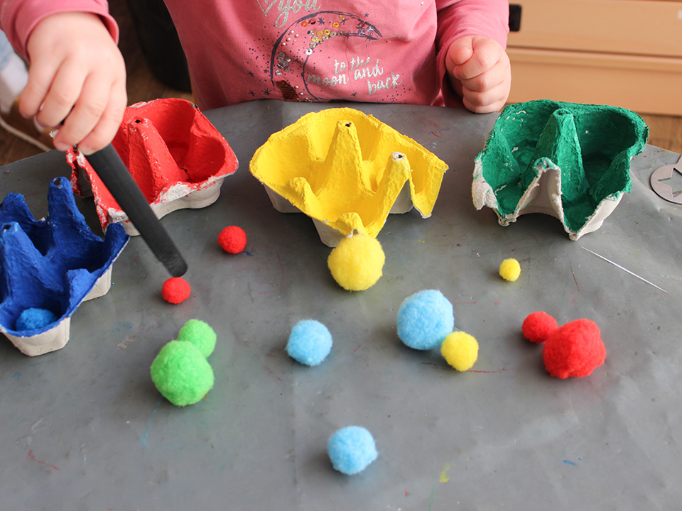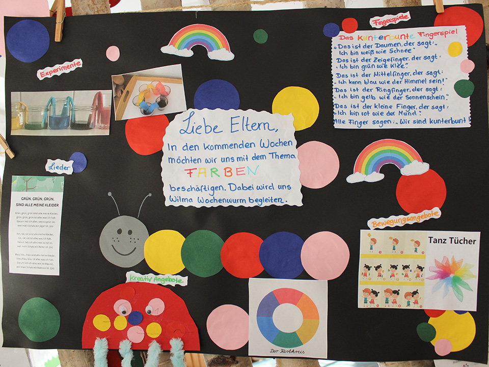 Wir sind mit dem Thema „Farben“ ins neue Jahr gestartet. Dabei begleitet uns stetig der „Wochenwurm Wilma“, bei dem jeder Tag eine andere Farbe hat. Wir haben zunächst die Grundfarben eingebracht und bei verschiedenen Angeboten die Farben immer wiederholt, wie z.B. sortieren, experimentieren, basteln, singen. Das Thema ist so vielfältig und wird uns noch länger durch das Kita-Jahr begleiten.
