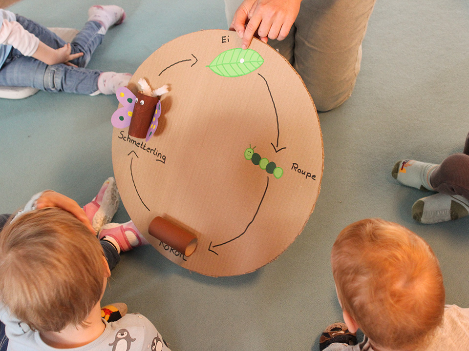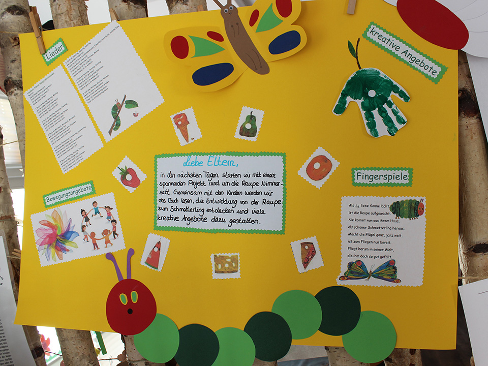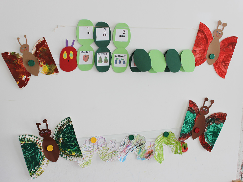 Passend zur Jahreszeit und unserem Thema Farben haben wir gemeinsam mit den Kindern das Projekt „Von der Raupe zum Schmetterling“ durchgeführt. Zum Einstieg begleitete uns die bekannte Geschichte „Die kleine Raupe Nimmersatt“, die über mehrere Wochen hinweg immer wieder aufgegriffen wurde. Die Kinder hatten viel Freude daran, mit der Raupe mitzufühlen, mitzuzählen und mitzuraten, was als Nächstes passiert.