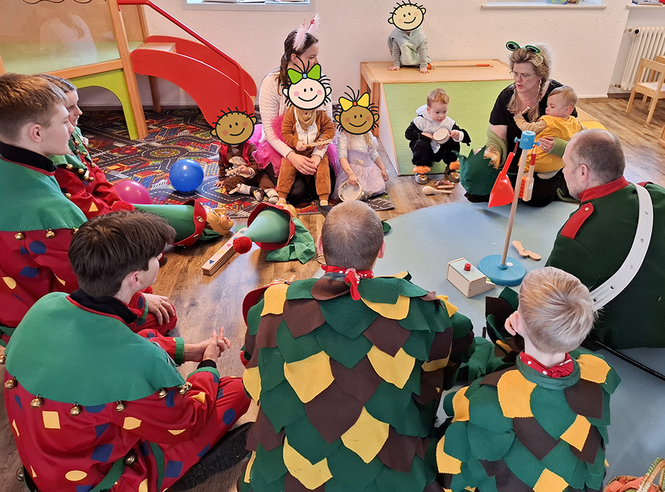 Wir starteten mit einem gemeinsamen Narrenfrühstück, um gestärkt in eine fröhliche Zeit voller Remmidemmi, Party und Konfetti zu starten. Am Freitag bekamen wir Besuch von der Narrenzunft, die ihre verschiedenen Häs und Masken vorstellte. Das ist jedes Jahr aufs Neue ein spannendes Erlebnis für die Kinder.