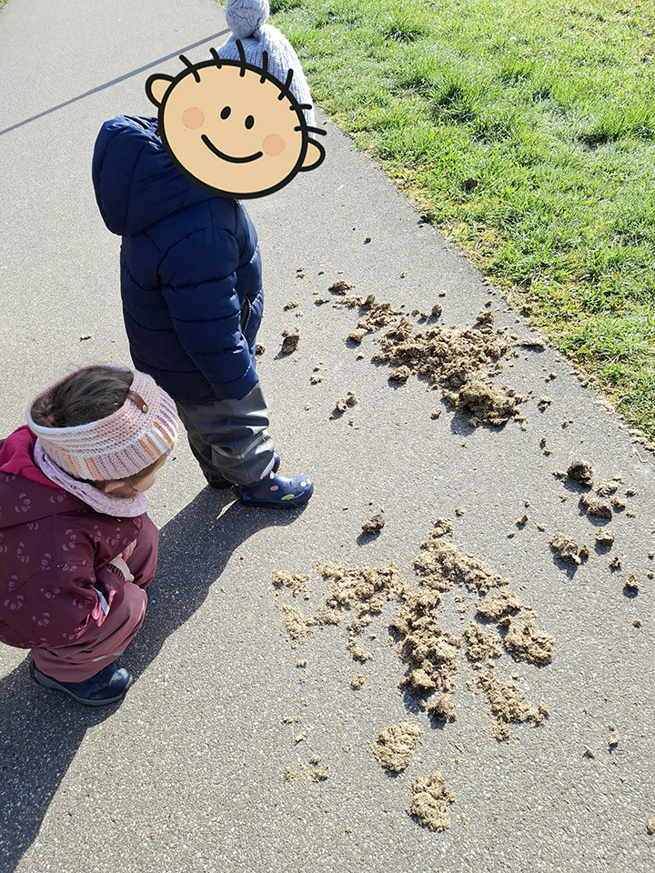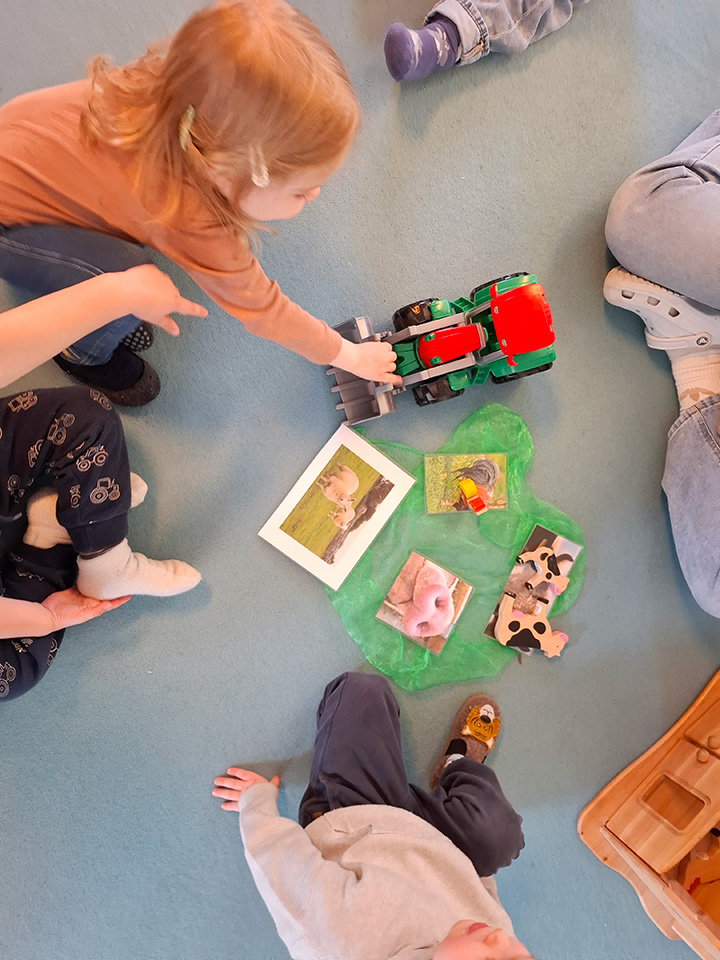 Bei unseren vielen Spaziergängen begegnen wir immer wieder verschiedenen Tieren wie Pferden, Schafen und Hühnern. Diese Erlebnisse haben die Kinder sehr begeistert – und genau daraus ist unser aktuelles Thema „Bauernhof“ entstanden.