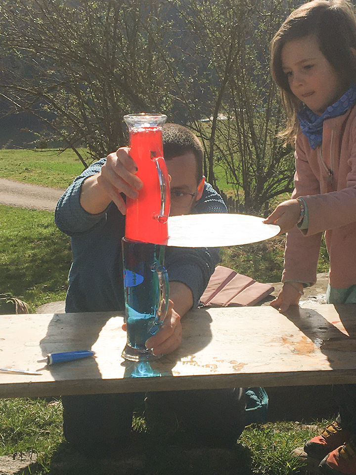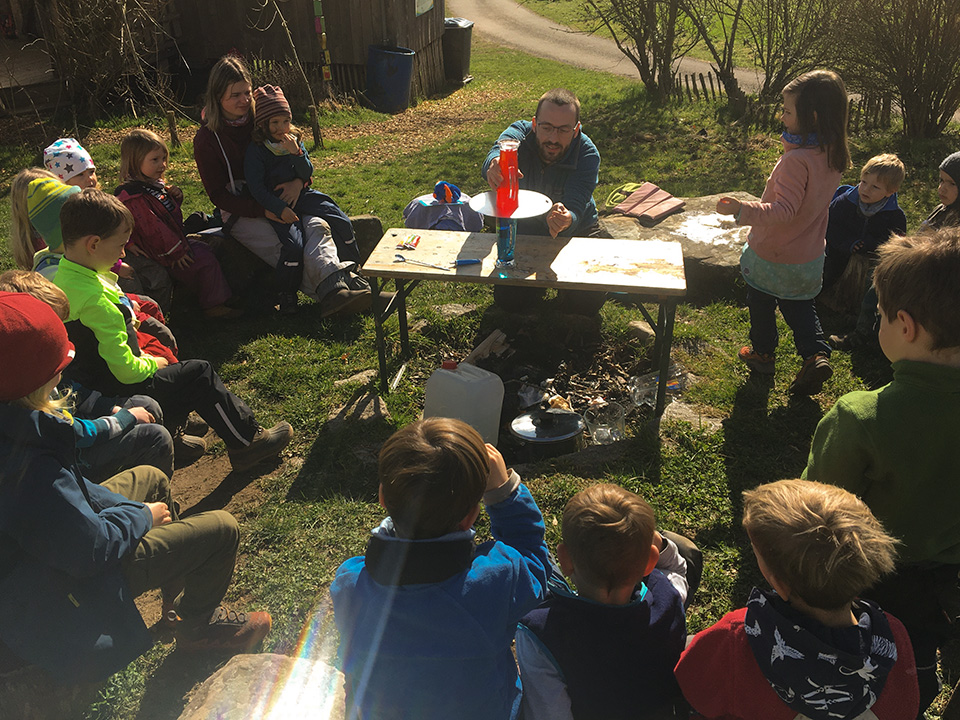 Spannende Experimente unternahmen die Waldfüchse zum Thema „Feuer, Wasser, Erde, Luft – die vier Elemente“. Wie kann es regnen? Wieso vermischen sich Farben – oder wieso auch nicht? Welche unterschiedlichen Arten von Erde gibt es? Wie entwickelt sich Rauch? Viele Fragen wurden durch diverse Versuche anschaulich gemacht und konnten dadurch beantwortet werden.