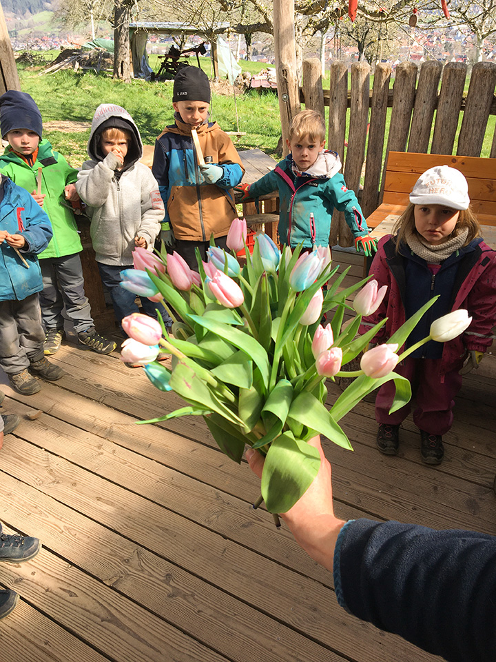 Der Frühling hat Einzug gehalten, und wir genießen die wärmenden Sonnenstrahlen beim Klettern, Spielen und Blumenpflücken. Nicht nur in die Natur kehren die Farben zurück, auch auf unserer Staffelei entstehen farbenfrohe Kunstwerke. Zu Ostern freuen sich die Kinder über eine Theatervorstellung im Freien, und zum Muttertag verschenken die Waldkinder kunterbunte Herzen an ihre Mamas und Papas.