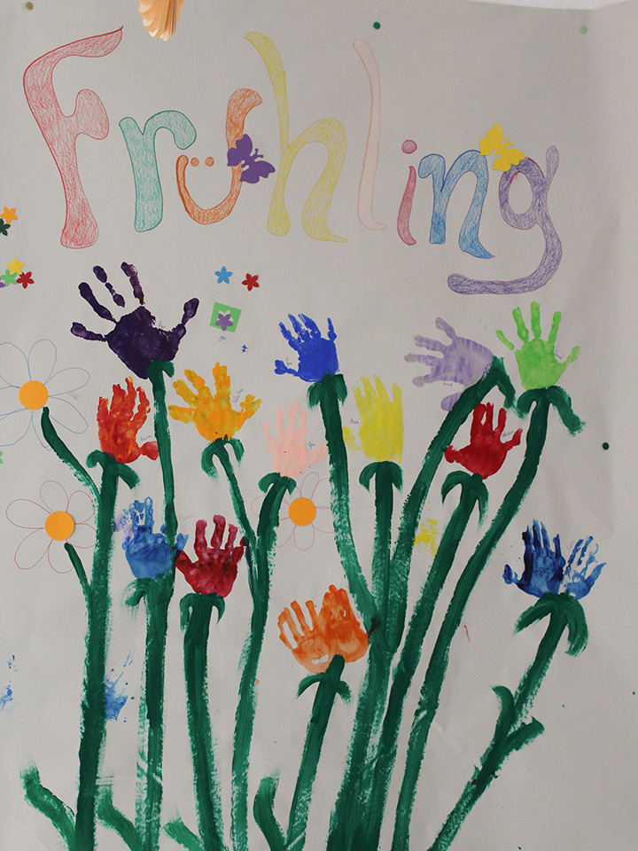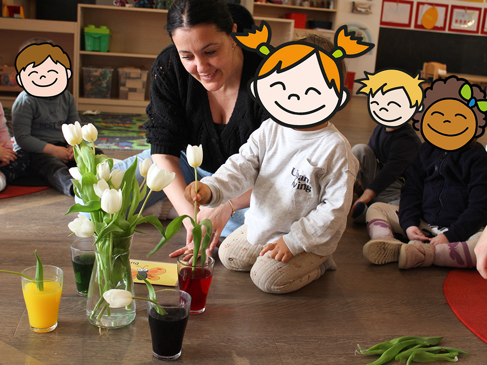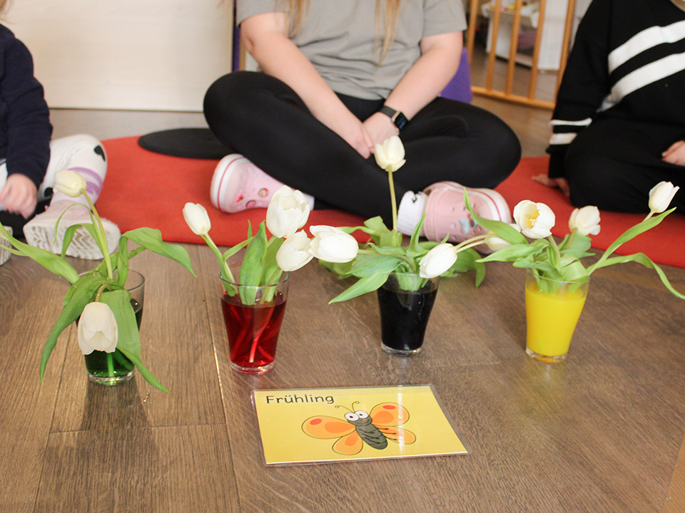 Passend zum Frühlingsbeginn starten wir mit einem Experiment im Morgenkreis. Die Kinder durften die Tulpen in das bunt gefärbte Wasser stellen und wir wollen beobachten, ob die Tulpen die bunten Farben annehmen. Gemeinsam gestalten wir die Kita bunt wie der Frühling. Zur Feier der Jahreszeit haben wir einen kleinen Kräutergarten angelegt. Gemeinsam haben wir die Erde nass gemacht und in kleine Bio-Töpfe eingefüllt. Obendrauf durften die Kinder samen streuen und nun können wir jeden Tag beobachten, wie unsere verschiedenen Kräuter wachsen und sie miteinander gießen und uns um die Pflanzen kümmern.