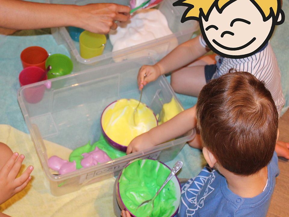 Gemeinsam haben wir den Schaum aus Kichererbsenwasser, ein bisschen Farbe und viel Neugier hergestellt. Dabei entstand eine herrlich weiche, bunte Masse, die sich wunderbar mit Löffeln, Bechern oder einfach mit den Händen verteilen ließ.
