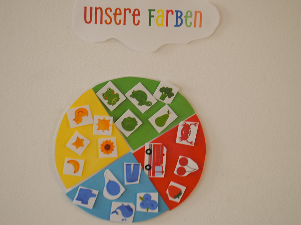 Im Juni stand bei uns alles im Zeichen der Farben. Die Kinder lernten die Grundfarben Rot, Blau, Grün und Gelb kennen und entdeckten, welche alltäglichen Dinge welche Farbe haben.
