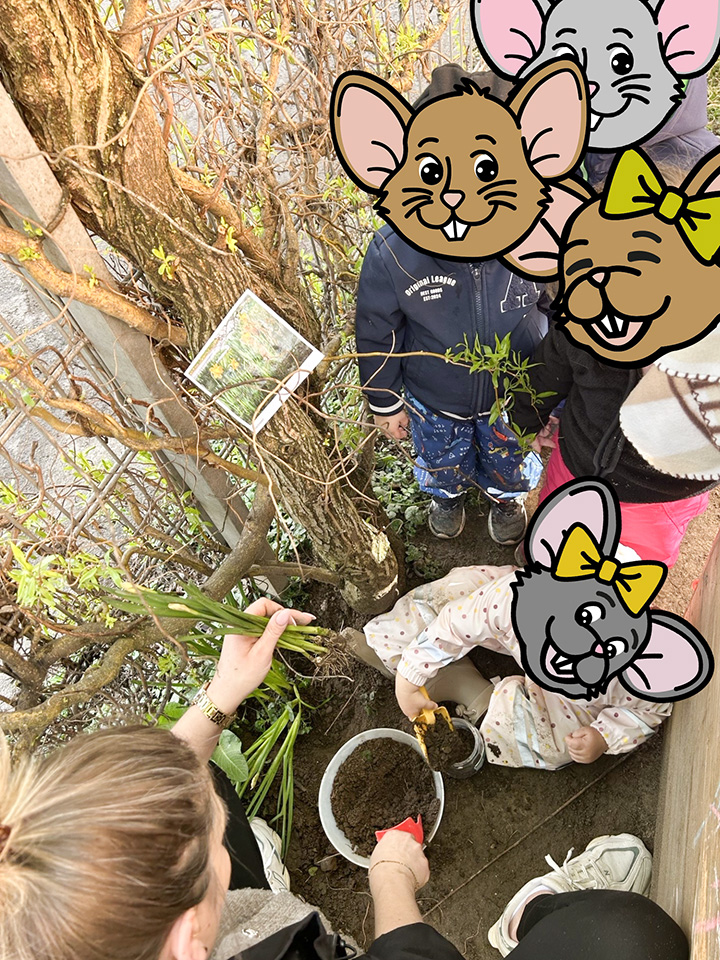 Auch im Garten gab es Spannendes zu entdecken: Dort fanden wir Narzissen, die wir gemeinsam vorsichtig ausgegraben haben. Dabei entdeckten die Kinder sogar einen Regenwurm, der für große Begeisterung sorgte.