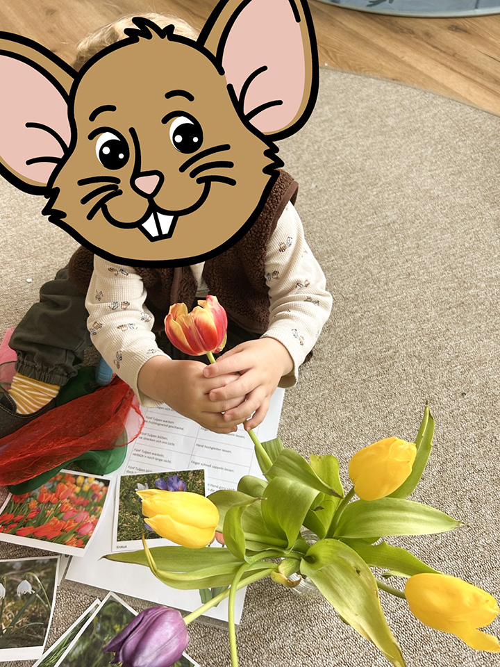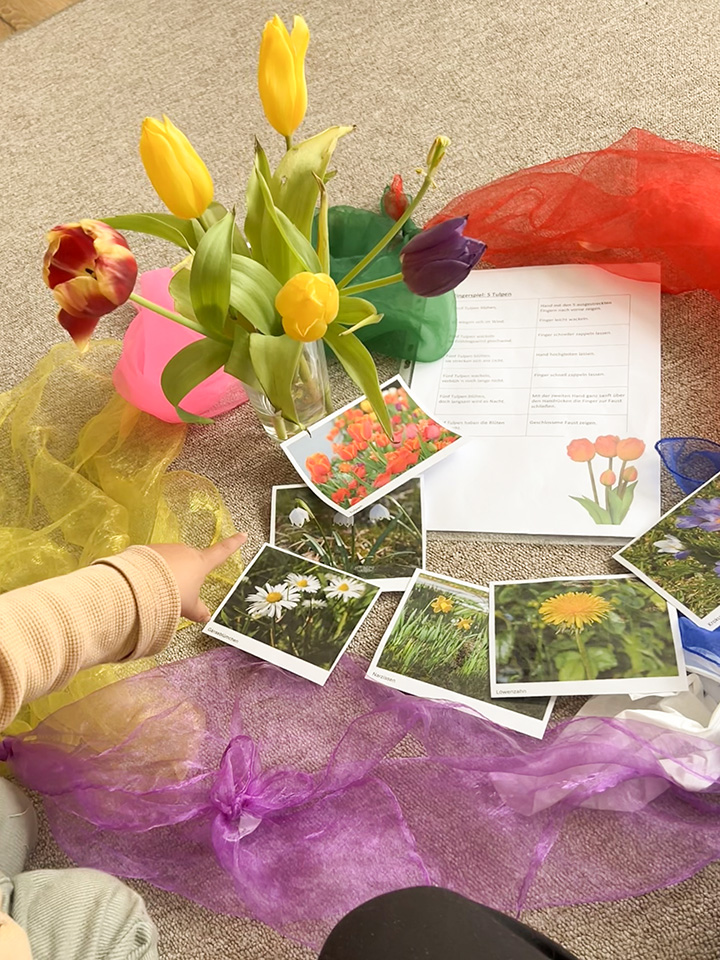 Im März haben wir gemeinsam mit den Kindern die ersten Frühlingsboten entdeckt. Wir sprachen darüber, welche Farben und Blumen der Frühling mit sich bringt und schauten uns Tulpen ganz genau an. Die Kinder konnten daran riechen, sie vorsichtig fühlen und neugierig erkunden.