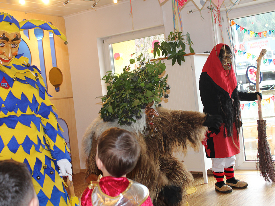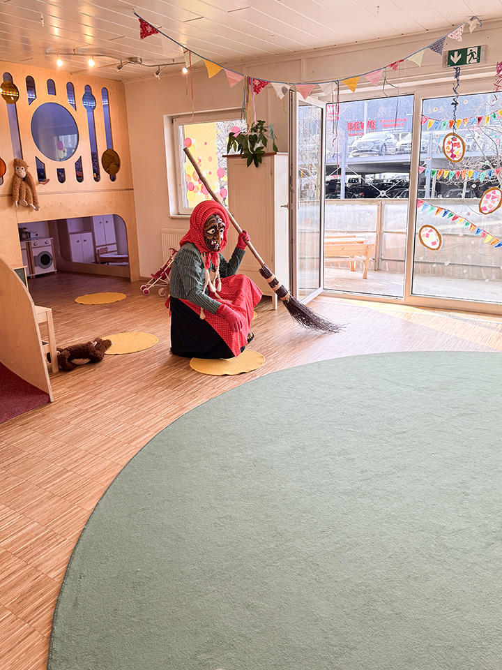 Im Februar wurde es bei uns richtig närrisch! Ein paar echte Narren statteten dem Kinderhaus Mauermatten einen Besuch ab und zogen mit ihren bunten Häs alle Blicke auf sich – die Kinder staunten mit großen Augen.