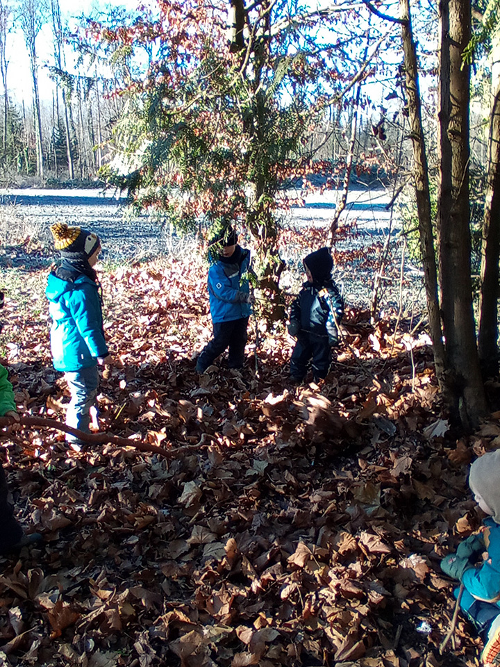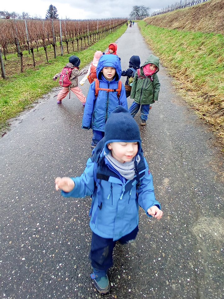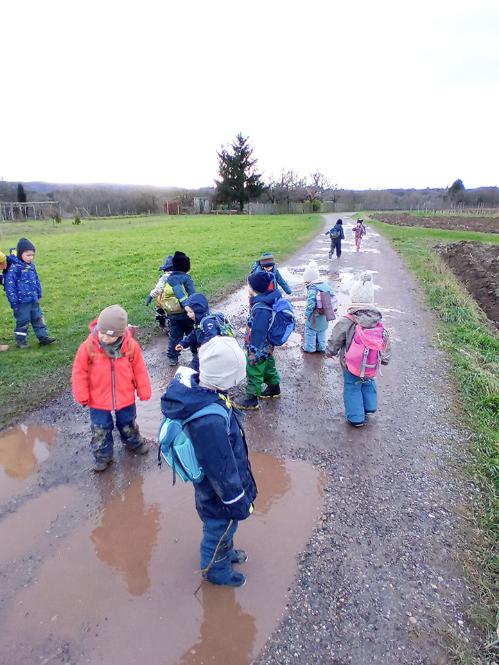 Trotz grauem Himmel wurde unser Spaziergang zu einem kleinen Abenteuer. Besonders die zahlreichen Pfützen sorgten für große Begeisterung – die Kinder sprangen fröhlich hinein und hatten sichtlich Spaß. Dabei konnten sie nicht nur ihre Bewegungsfreude ausleben, sondern auch ihre Sinne schulen und auf spielerische Weise die Natur entdecken.