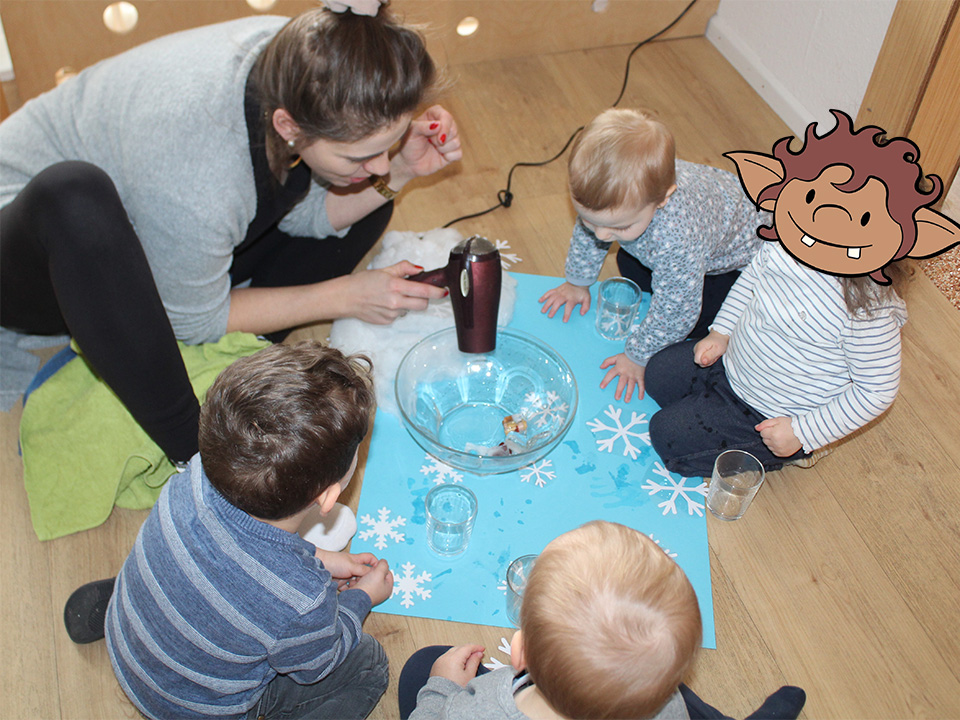 Auch in den beiden Krippengruppen stand der Winter im Mittelpunkt. Bei verschiedenen Angeboten hatten die Kleinsten die Möglichkeit, den Winter mit allen Sinnen zu erleben – sei es beim Spielen mit Eis, bei winterlichen Bastelaktionen oder beim gemeinsamen Singen passender Lieder.