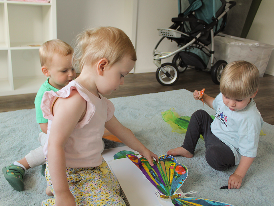 Im gesamten Kinderhaus – in beiden Krippengruppen sowie in der altersgemischten Gruppe – haben wir uns intensiv mit dem Thema „Von der Raupe zum Schmetterling“ beschäftigt.