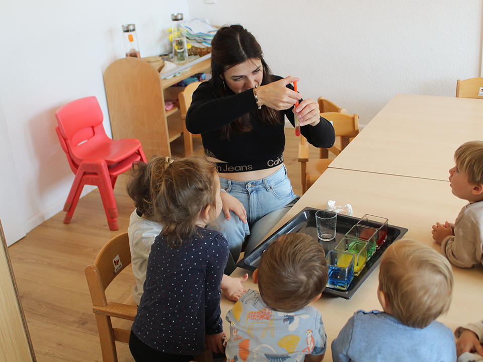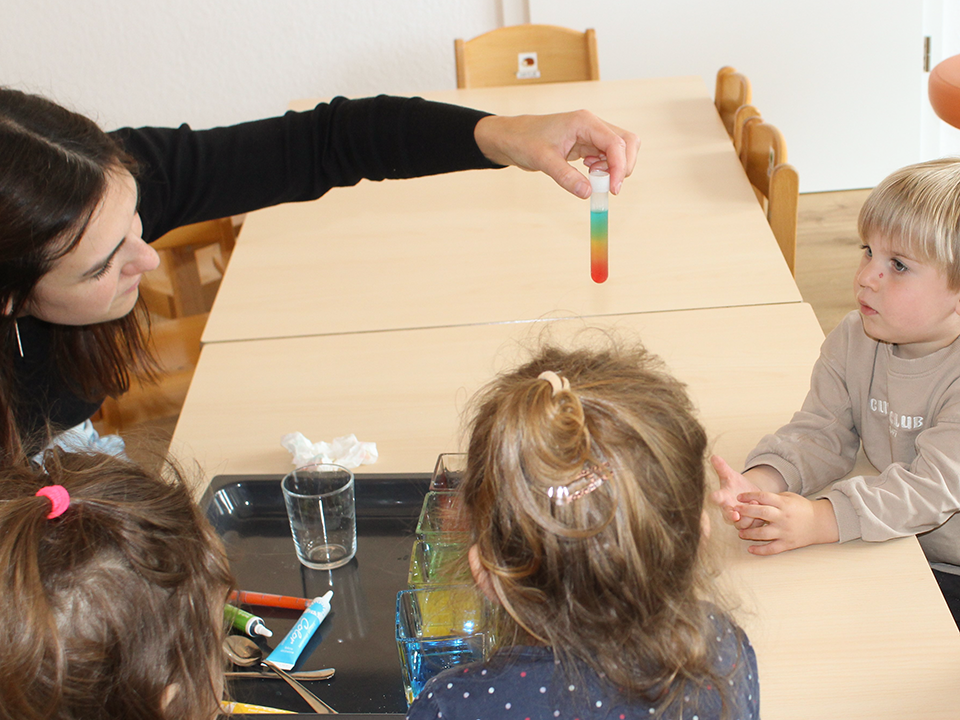 Ein besonderes Highlight war ein farbenfrohes Experiment: Mit Lebensmittelfarbe, Wasser und Zucker gestalteten die Kinder im Reagenzglas ihren eigenen Regenbogen. Fasziniert beobachteten sie, wie sich die bunten Schichten dank unterschiedlicher Zuckerkonzentrationen nicht vermischten – ein echtes kleines Wunder im Glas!