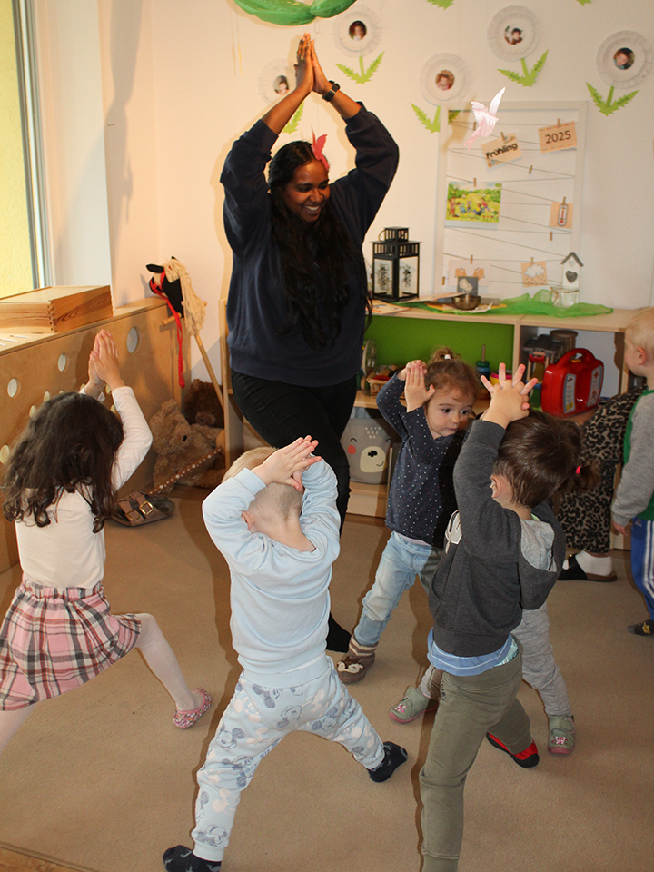 Auch sonst wurde der Frühling sinnlich erlebbar gemacht: Die Kinder rochen an frischen Blumen, kosteten verschiedenes Obst und lauschten aufmerksam den ersten Frühlingsgeräuschen. Zum Abschluss fanden die Kinder beim kindgerechten Yoga zur Ruhe. Sie lernten, ihre Atmung wahrzunehmen, sich selbst zu spüren und bewusst zu entspannen – ein sanfter Ausklang nach einem bunten und erlebnisreichen Tag.