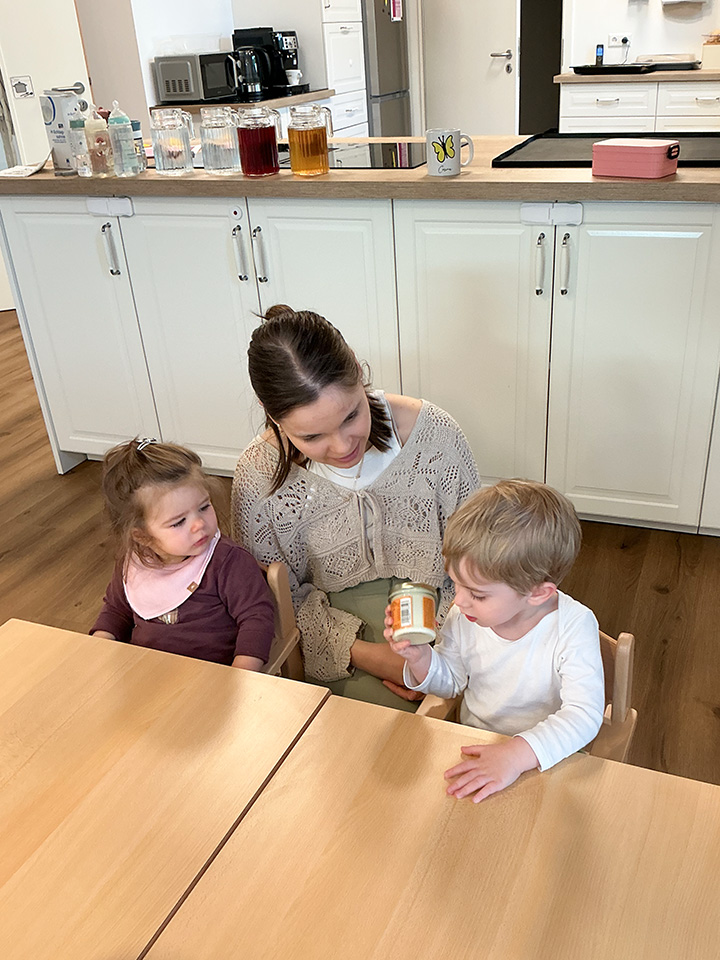 Die Räume sind hell und frisch eingerichtet. Im Flur herrscht eine Willkommensatmosphäre mit der Einladung zum Gespräch. Im vorderen Bereich sind Abstellplätze für Kinderwägen vorgehalten. Die Garderoben der Kinder sind im vorderen Bereich und nach rechts zu den Gruppenbereichen hin. In den Gruppen bestehen die Zugänge zu den Ruhe- und Schlafbereichen. Die Sanitärbereiche befinden sich geradeaus vom Flur abgehend, genügend Wickelbereiche und Toiletten für alle Altersbereiche und auch für unser Team wunderbare Bedingungen. Im hinteren Bereich befinden sich die Versorgungsräume und das Bistro – es handelt sich um einen offenen Bereich mit Sicht auf die Tischgruppen und Anrichte. Wir bereiten hier das Essen vor und haben die Lagerbereiche direkt neben der Küche. Abrundend befindet sich ein Bewegungs- oder Intensivraum direkt in der Nähe.