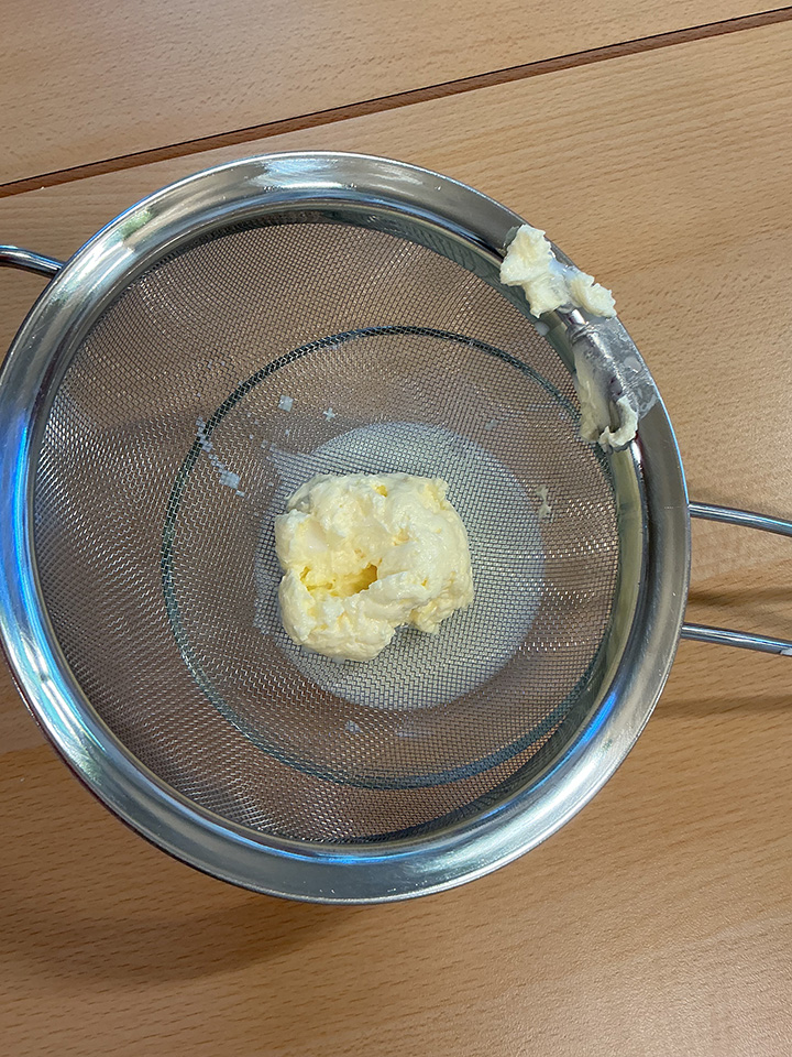 Passend zu unserem aktuellen Thema Bauernhof haben die Glühwürmchen selbst Butter hergestellt. Dafür wurde Sahne in ein Schraubglas gefüllt und so lange kräftig geschüttelt, bis daraus Butter entstand. Anschließend wurde die Masse in ein Sieb gegeben, sodass die Buttermilch von der Butter getrennt werden konnte.
