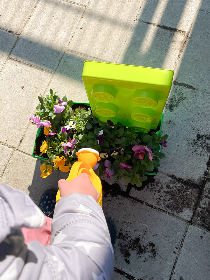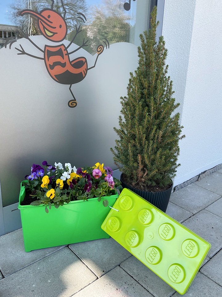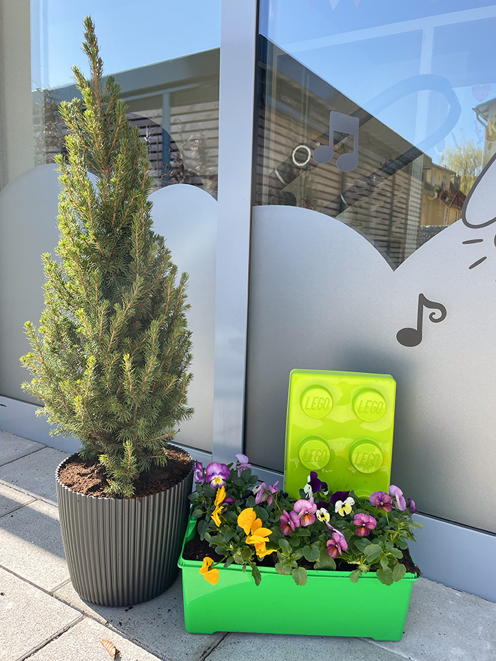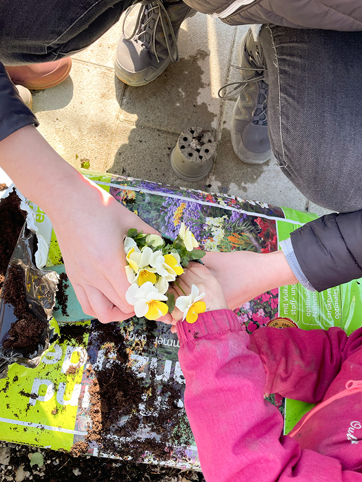 Gemeinsam mit den Kindern haben wir Hornveilchen und Efeu in ausrangierte Gummistiefel gepflanzt. Zuerst wurden Löcher in die Sohlen gebohrt, dann kam Blähton hinein, anschließend Erde und schließlich die Pflanzen. Zum Schluss wurden sie mit der Gießkanne gegossen und mit Haken am Zaun befestigt.