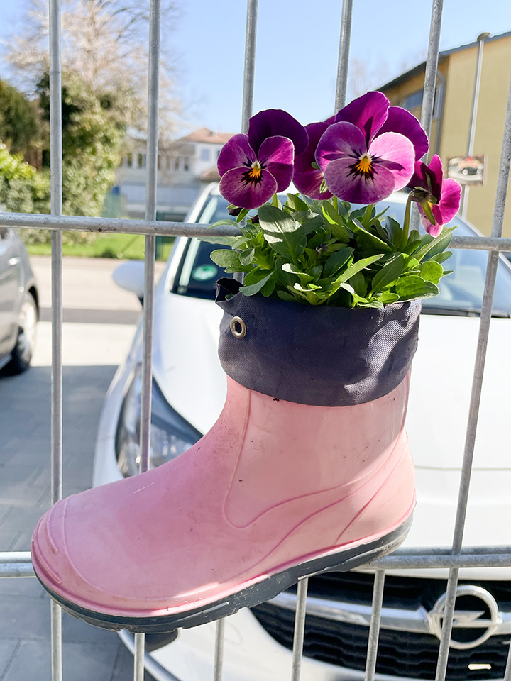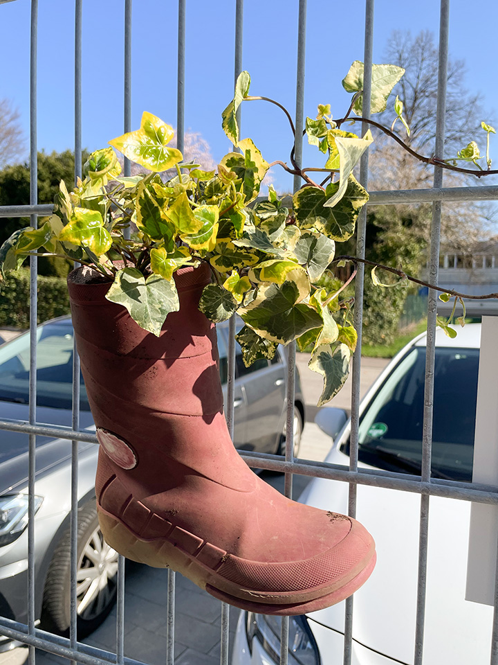 Nun wachsen die bepflanzten Gummistiefel als kreativer Sichtschutz an unserem Zaun entlang. Ein herzliches Dankeschön an die Gärtnerei Göppert für diese tolle Unterstützung!