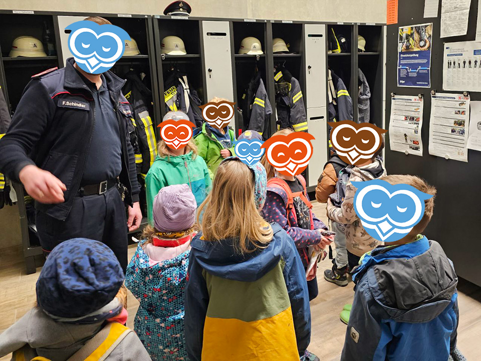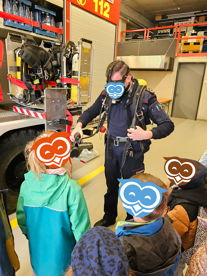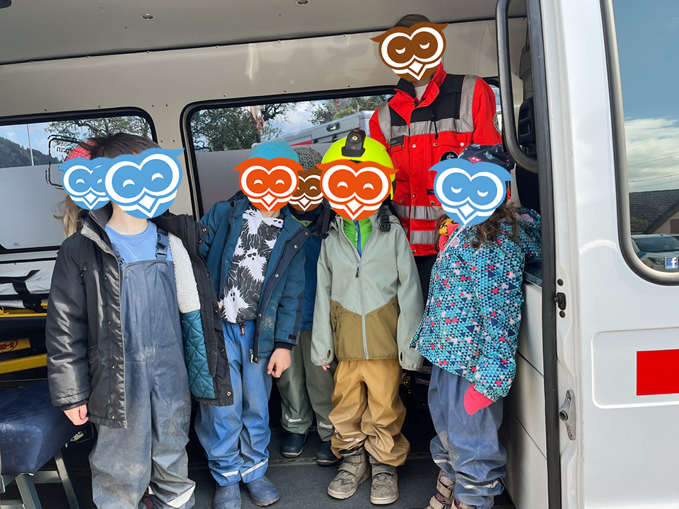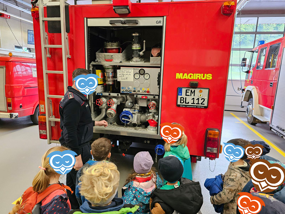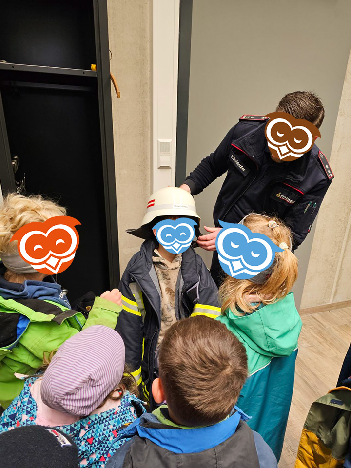 Im April haben die Schulanfänger vom Eulennest einige der wichtigsten Berufe in unserer Gesellschaft kennen gelernt. Gemeinsam mit den Schulanfängern des Kinderhaus Bärenzauber haben wir zunächst die örtliche Feuerwehr besuchen dürfen. Der Feuerwehrkommandant hat uns dabei zunächst erklärt, wie Brände entstehen können und was zu tun ist, wenn dieser Ernstfall tatsächlich einmal eintritt. Anschließend haben wir gemeinsam noch die Ausrüstung und Fahrzeuge der Feuerwehr begutachtet und durften zum Abschluss sogar eine kurze Runde in einem Feuerwehrauto mitfahren.