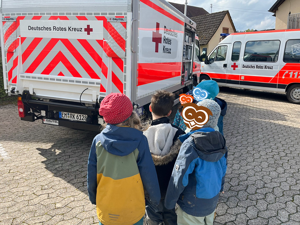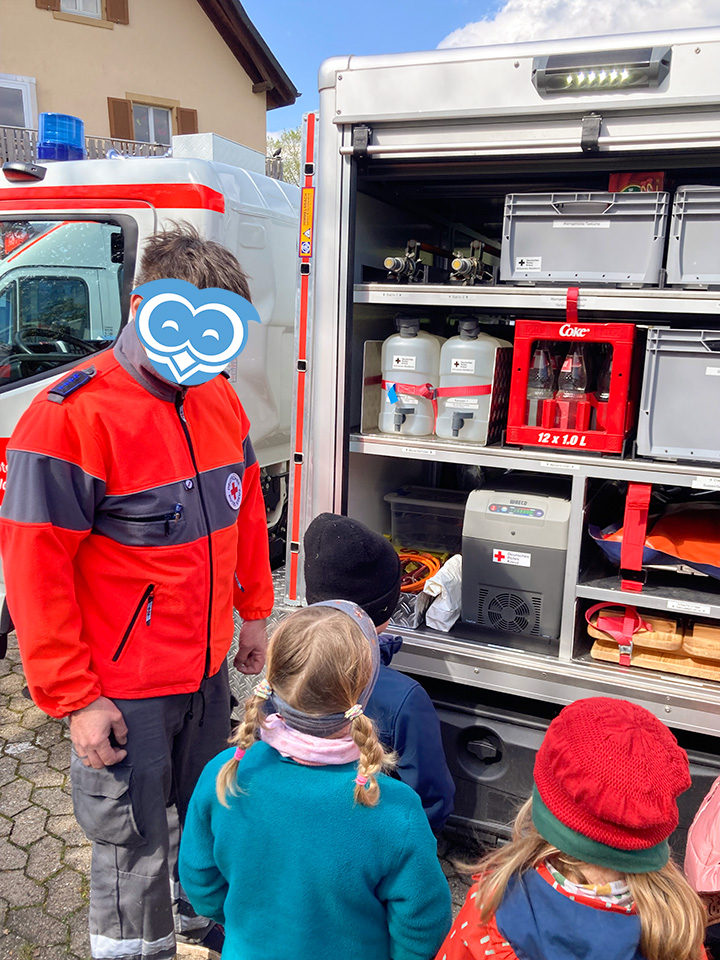 Einige Tage später hat uns die Ortsgruppe des Deutschen Roten Kreuzes aus Waldkirch gezeigt, was die Arbeit des Rettungsdienstes darstellt. Dazu haben wir uns gemeinsam einen Krankentransportwagen sowie einen Gerätewagen angesehen und uns wurde die Ausstattung sowie deren Funktion beispielhaft erklärt. Im Anschluss haben wir sogar noch geübt, selbst einen Verband anzulegen und besprochen, wie man im Notfall reagieren sollte. Das waren sehr spannende Einblicke für uns in diese wichtigen Blaulicht-Berufe.