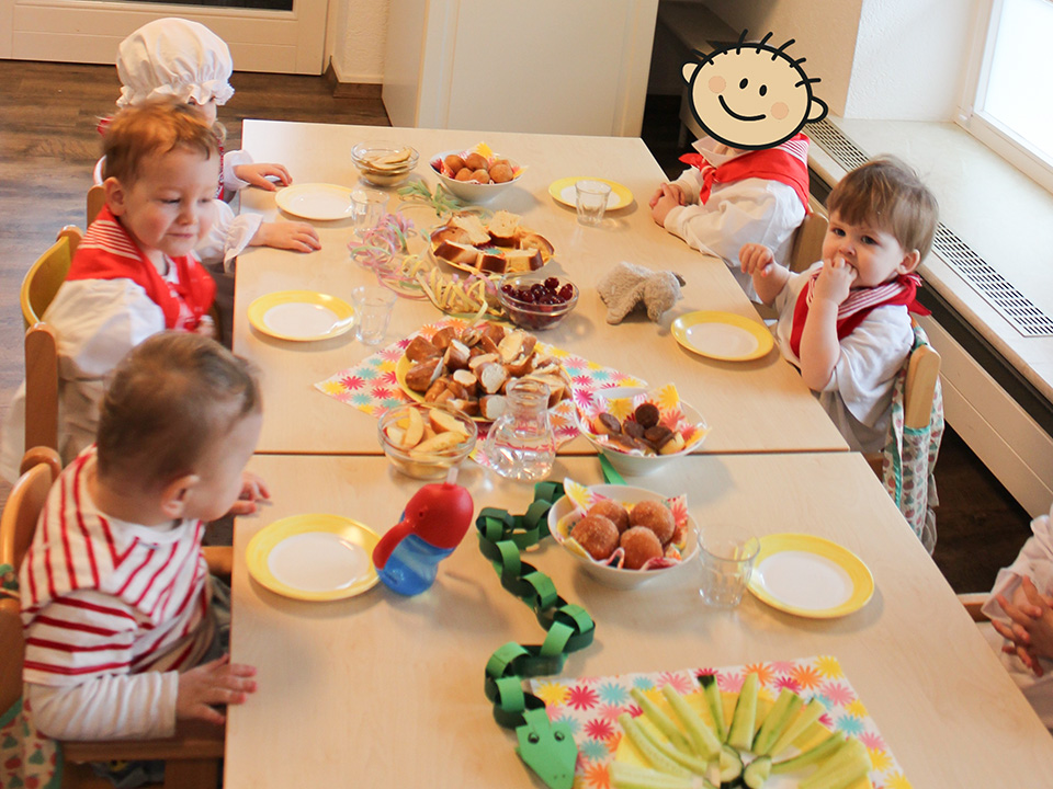 Wir starteten mit einem gemeinsamen Narrenfrühstück, um gestärkt in eine fröhliche Zeit voller Remmidemmi, Party und Konfetti zu starten. Am Freitag bekamen wir Besuch von der Narrenzunft, die ihre verschiedenen Häs und Masken vorstellte. Das ist jedes Jahr aufs Neue ein spannendes Erlebnis für die Kinder.