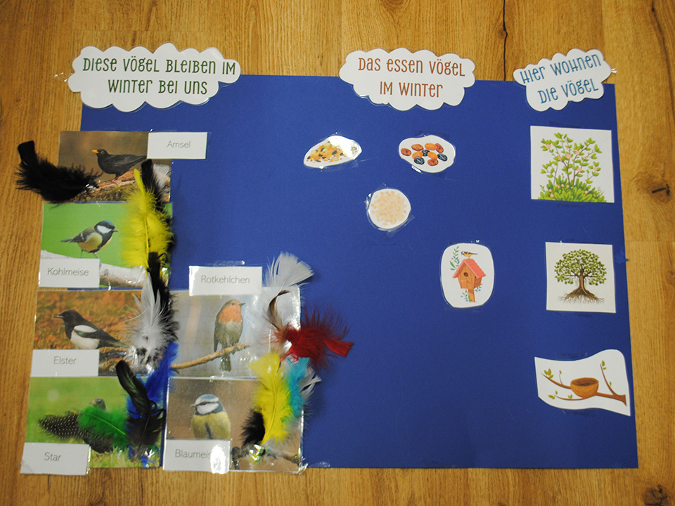 Gemeinsam haben herausgefunden welche Vögel bei uns im Winter hierbleiben, was sie im Winter fressen und wo sie wohnen. Außerdem haben wir uns die bunten Federn der Vögel angeschaut und uns angehört, wie die einzelnen Vögel singen und klingen. Wir haben selbst Vögel mit der Murmel-Technik gestaltet, getont und angemalt, Vogelfutter hergestellt und im Garten aufgehängt. Es war ein tolles Projekt was uns allen viel spaß gemacht hat.