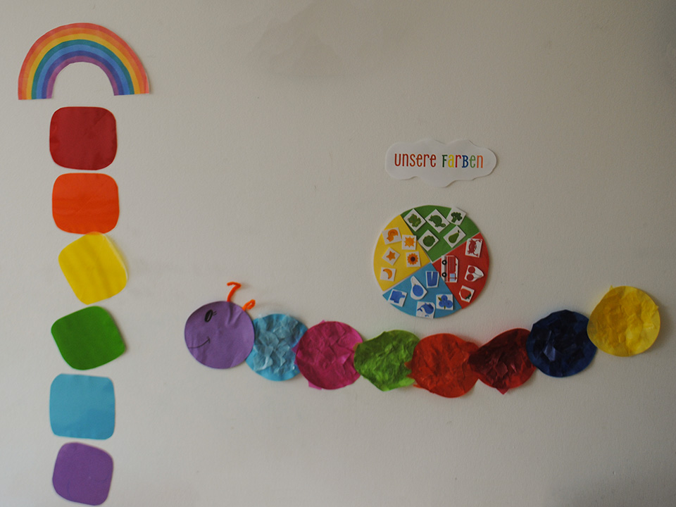 Gemeinsam sangen wir fröhliche Lieder und tanzten bunte Tänze, die richtig gute Laune machten. Kreativ ging es natürlich auch zu: Wir gestalteten eine farbenfrohe Raupe und einen leuchtenden Regenbogen – jeder durfte einen Teil der Raupe und seinen eigenen bunten Regenbogen gestalten.