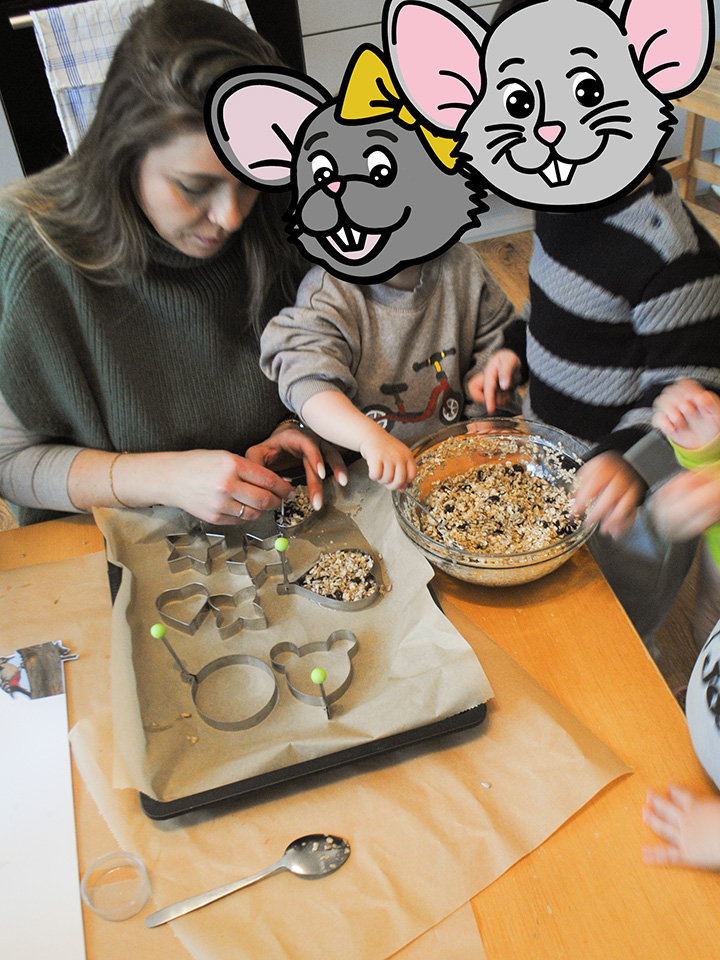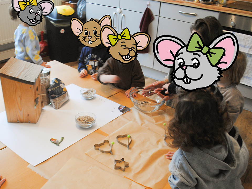 Damit unsere heimischen Vögel auch in der kalten Jahreszeit genug zu fressen finden, stellten wir gemeinsam Vogelfutter her. Die Kinder mischten Kokosfett mit verschiedenen Samen und füllten die Masse in unterschiedliche Förmchen. Anschließend richteten wir gemeinsam eine Futterstelle ein.