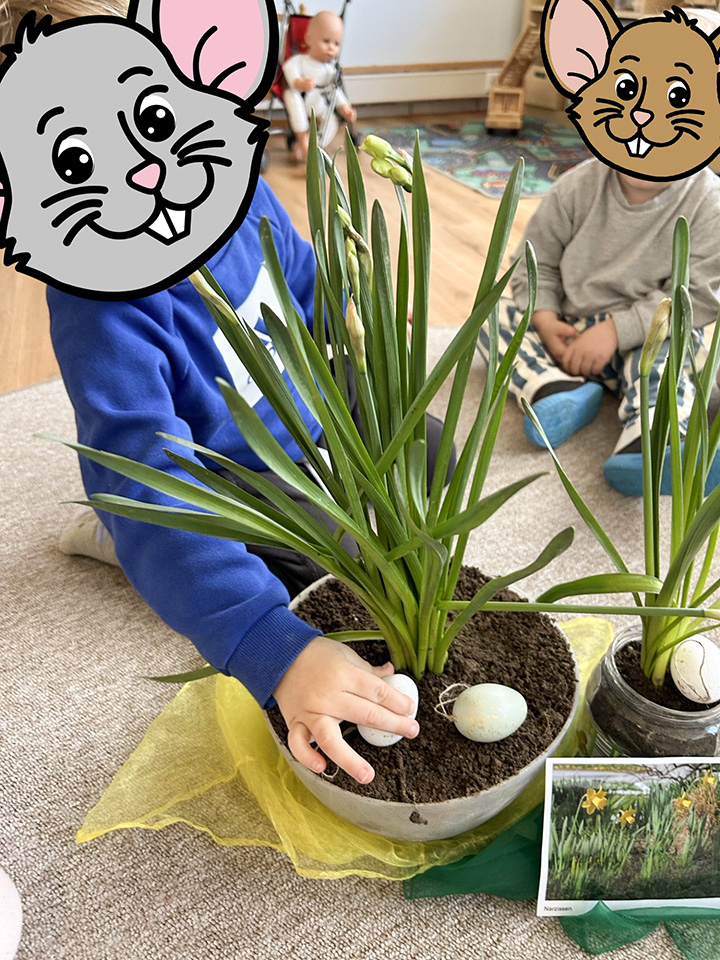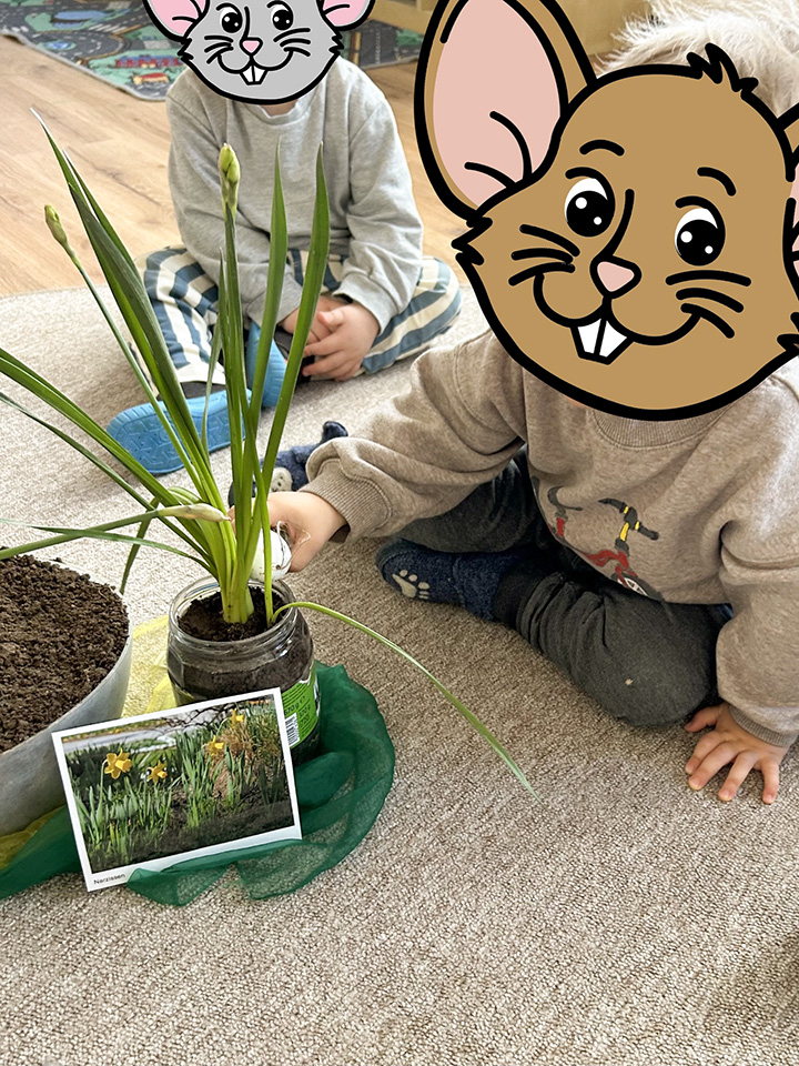 Auch im Garten gab es Spannendes zu entdecken: Dort fanden wir Narzissen, die wir gemeinsam vorsichtig ausgegraben haben. Dabei entdeckten die Kinder sogar einen Regenwurm, der für große Begeisterung sorgte.