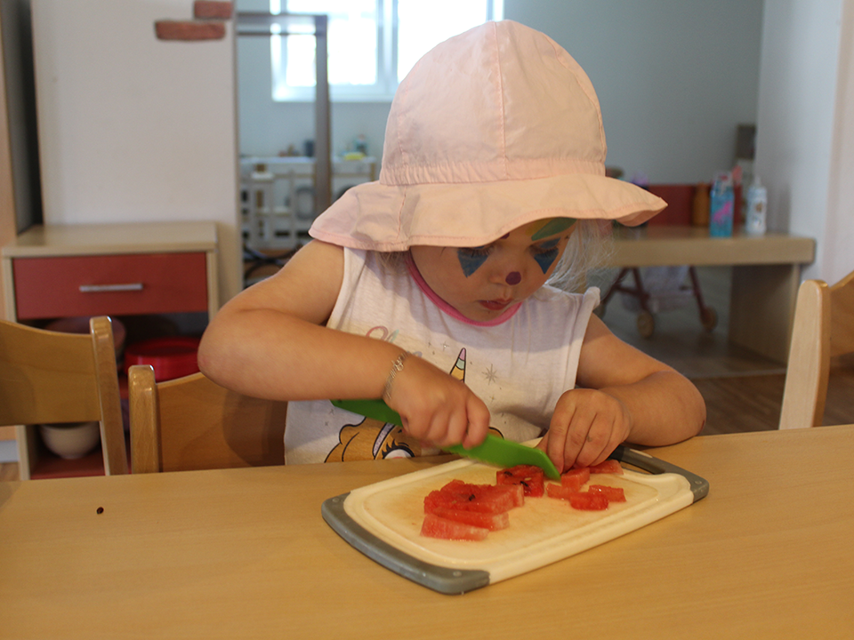 Gemeinsam betrachteten wir das beliebte Bilderbuch „Die kleine Raupe Nimmersatt“, bastelten farbenfrohe Schmetterlinge und schnitten frisches Obst, aus dem ein leckerer Obstsalat entstand – ganz wie im Buch!
