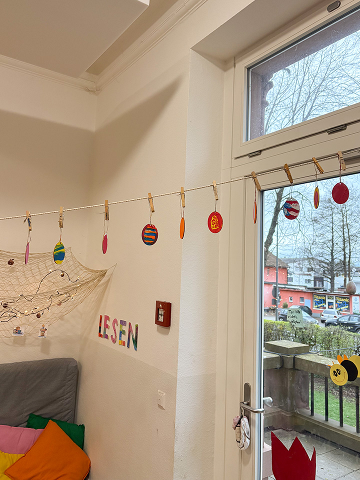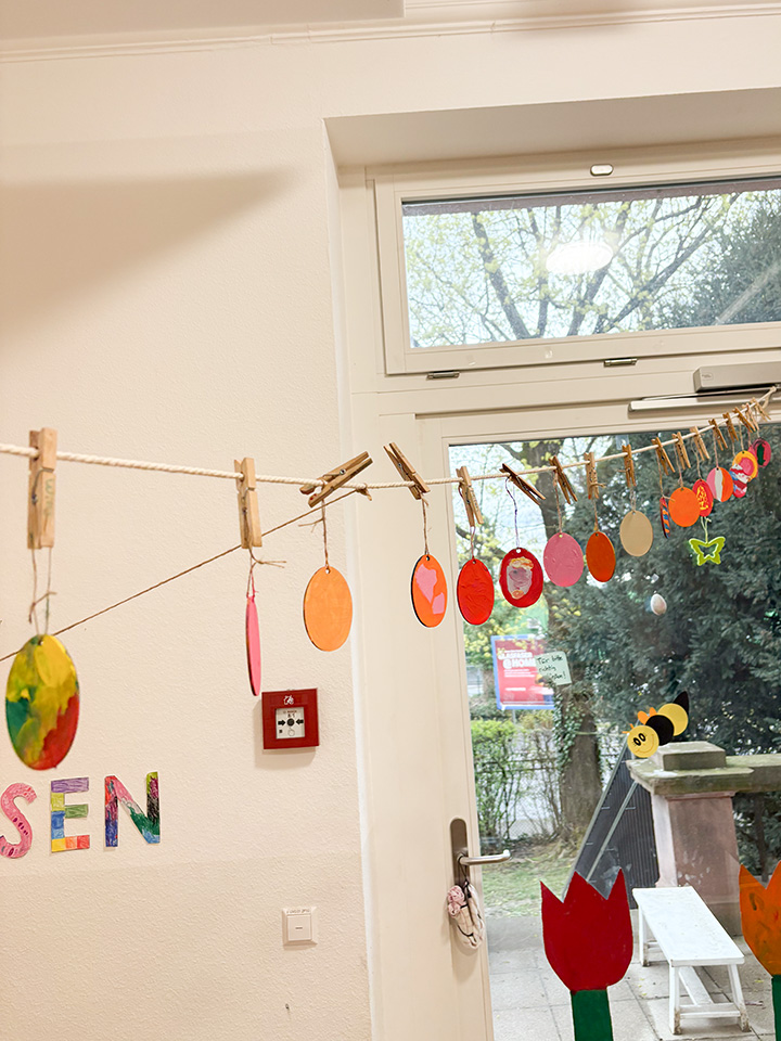 Die Kinder wählten ihre Farben selbst aus und probierten unterschiedliche Gestaltungsmöglichkeiten aus. So entstanden viele individuelle Kunstwerke, die unseren Gruppenraum nun fröhlich zu Ostern schmücken.