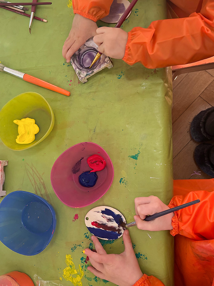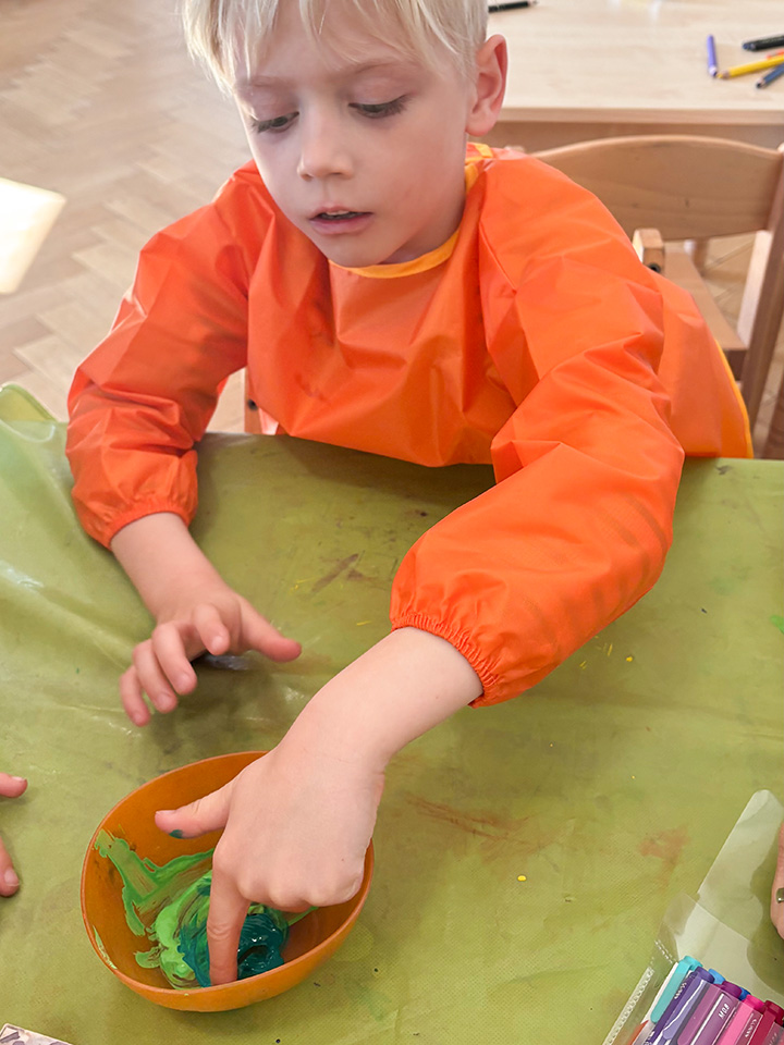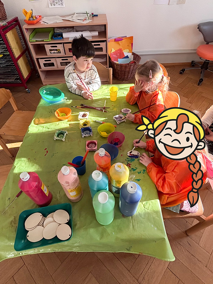 Passend zum Thema Ostern gestalteten die Kinder flache Holzeier als Dekoration für den Gruppenraum. Mit verschiedenen Farben und Materialien bemalten und verzierten sie die Eier und konnten dabei ihre eigenen Ideen kreativ umsetzen.