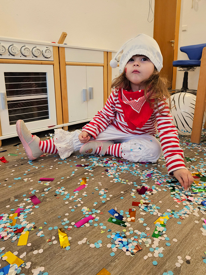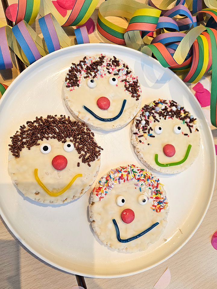 In der Fasnetszeit wurde auch fleißig gebacken. Gemeinsam haben wir einen köstlichen Konfettikuchen gezaubert. Aus Reiswaffeln entstanden bunte Clowns, und mit Klopapierrollen gestalteten wir farbenfrohe Haarfrisuren.