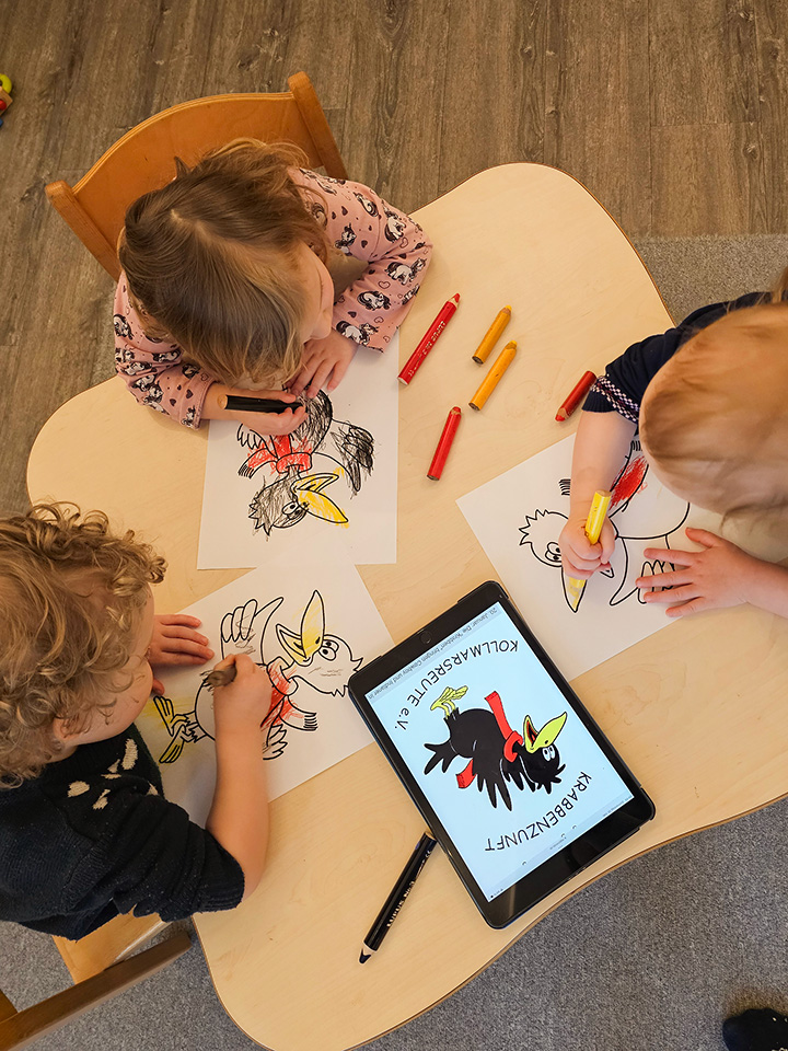 Wir singen fröhlich Fasnetslieder und genießen die ausgelassene, gemeinsame Atmosphäre. Ein Rabe hat uns in der Kita einen überraschenden Besuch abgestattet. Jana, die in einer Zunft ist, hat uns ihren Raben ganz genau vorgestellt. Wer sich traute, durfte sogar selbst die Maske anlegen.