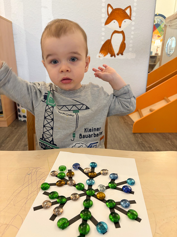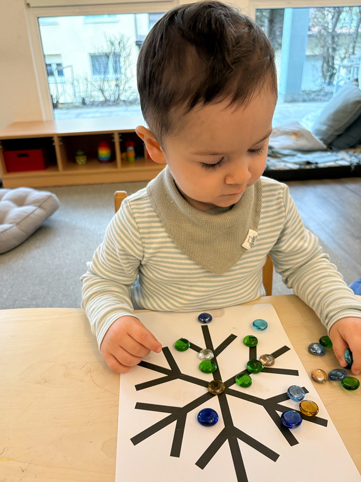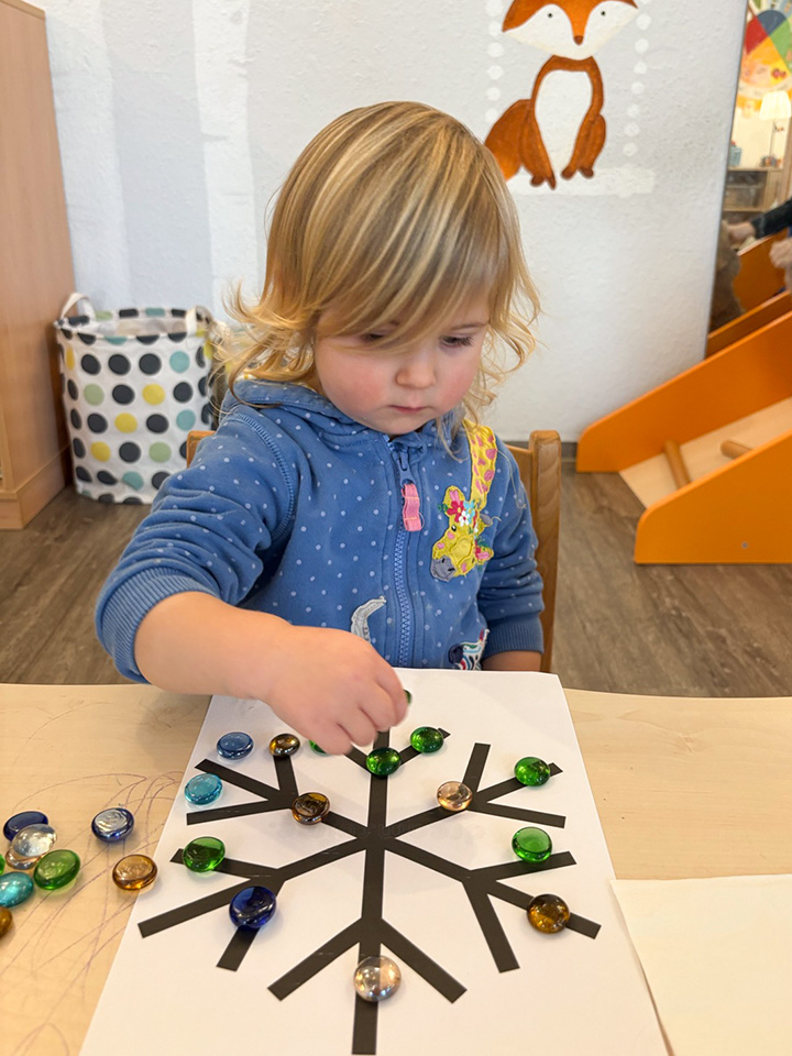Passend zum ersten Schnee haben wir uns auch im Gruppenraum kreativ mit dem Winter beschäftigt. Mit großen Muggelsteinen legten die Kinder gemeinsam Schneeflocken nach. Mit viel Neugier und Freude betrachteten die Kinder die Steine, sortierten sie und legten sie auf vorbereitete Vorlagen. Dabei entstanden viele wunderschöne und ganz unterschiedliche Schneeflocken. Manche Kinder legten die Muster genau nach, andere probierten ihre eigenen Ideen aus.