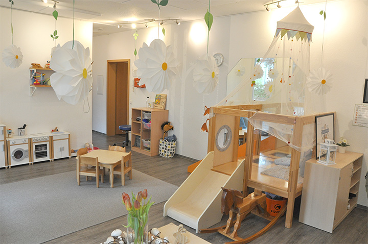 Der Hauptteil unserer pädagogischen Arbeit spielt sich in unserem Gruppenraum ab. Dieser bietet den Kindern jede Menge Möglichkeiten, sich während dem Freispiel frei zu entfalten. Neben einer kleinen Kinderküche gibt es eine zweite Ebene mit einer kleinen Rutsche, die zum Toben und aktiv sein einlädt. Ebenso stehen den Kindern verschiedene Puzzle, Bücher, Steckspiele und vieles mehr zur Verfügung, was für die Kinder in Regalen frei zugänglich ist. Unser Gruppenraum wird zudem für den Morgenkreis, wie auch für spezifische Angebote genutzt.