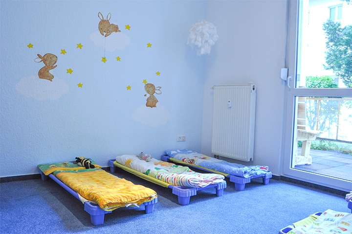 Nach dem gemeinsamen Mittagessen werden die Kinder für den Mittagsschlaf im Schlafraum hingelegt. Dort können die Kinder zur Ruhe kommen. Denn Kinder brauchen neben Angeboten und Bewegung auch immer wieder Ruhephasen, in denen sie das Erlebte und Gelernte verarbeiten können.