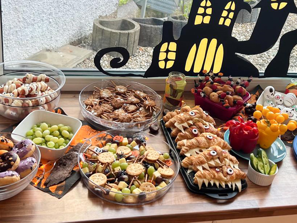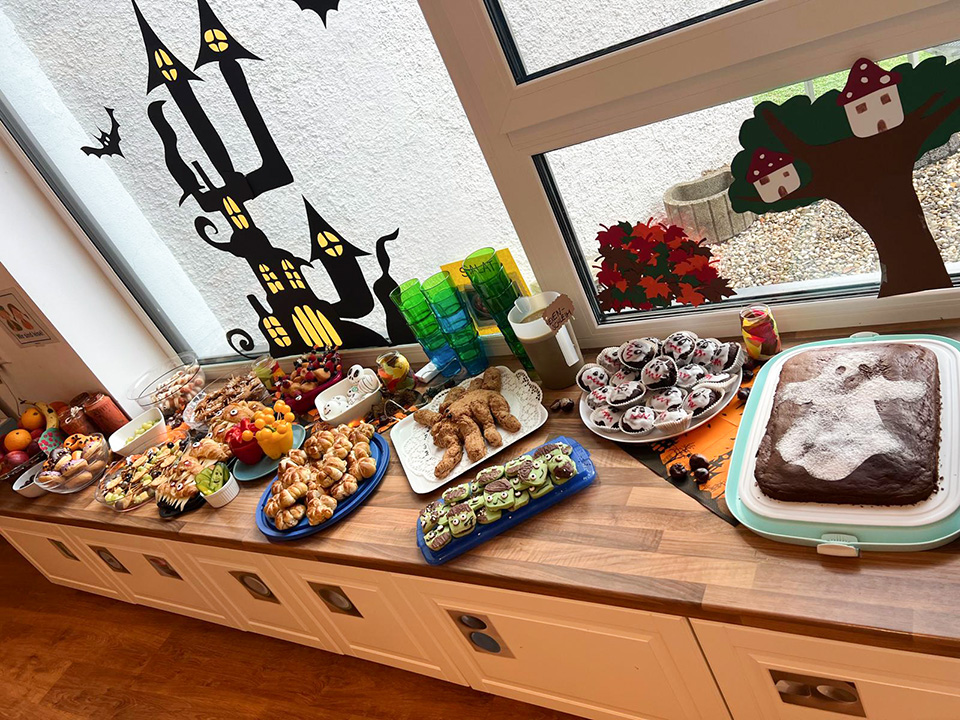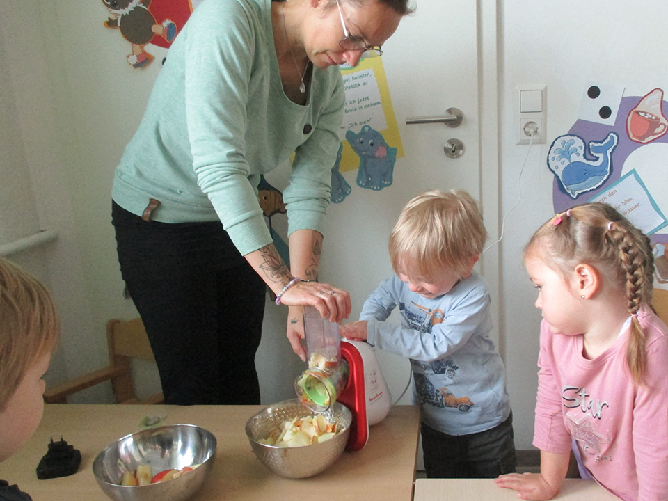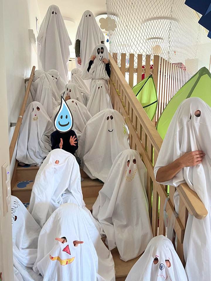 Passend zum Herbst haben alle Gruppen das Kinderhaus liebevoll mit Kastanien und Kürbissen geschmückt. Jede Gruppe gestaltete eigene herbstliche Angebote: Die Wirbelwindgruppe verkleidete sich an Halloween als kleine Gespenster und genoss ein leckeres Halloween-Frühstück. Die Regentröpfchen bastelten aus Salzteig Anhänger. Die Wölkchen stellten selbst Apfelchips her und bastelten viele weitere kreative Herbstideen. Die Kinder haben dabei viel über den Herbst gelernt und hatten bei den verschiedenen Aktivitäten großen Spaß.