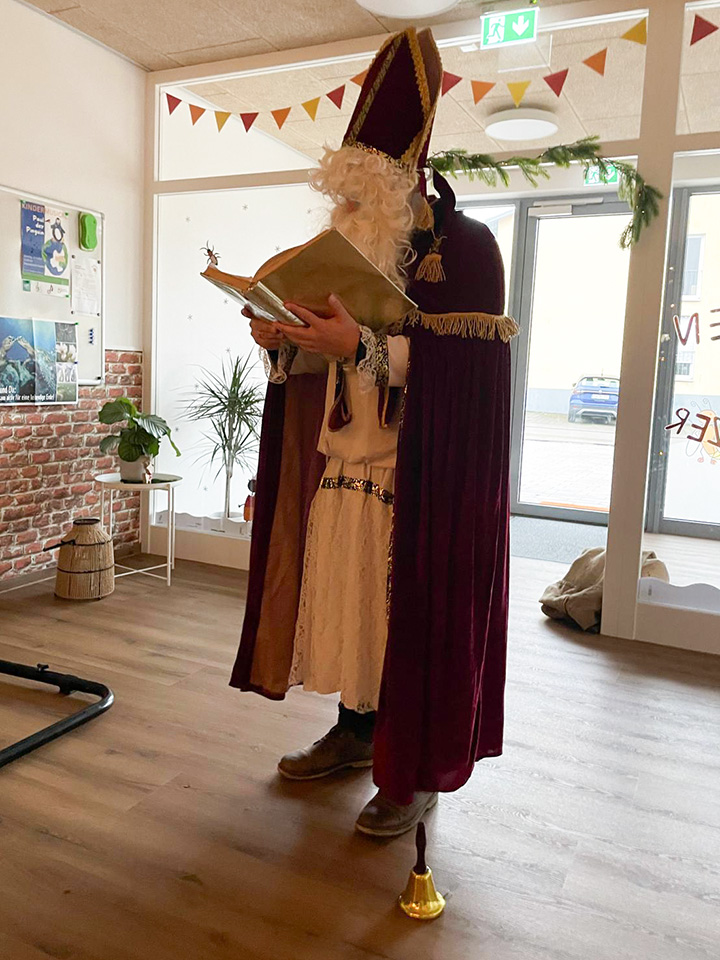 Am Freitag, den 05.12.2025, besuchte uns der heilige St. Nikolaus im Kinderhaus Sonnentänzer. Die Kinder waren schon ganz aufgeregt und hatten fleißig Nikolauslieder gesungen und Gedichte geübt. Der Nikolaus schlug in seinem goldenen Buch nach, ob die Kinder brav waren und sich gut in der neuen Kita eingelebt hatten.