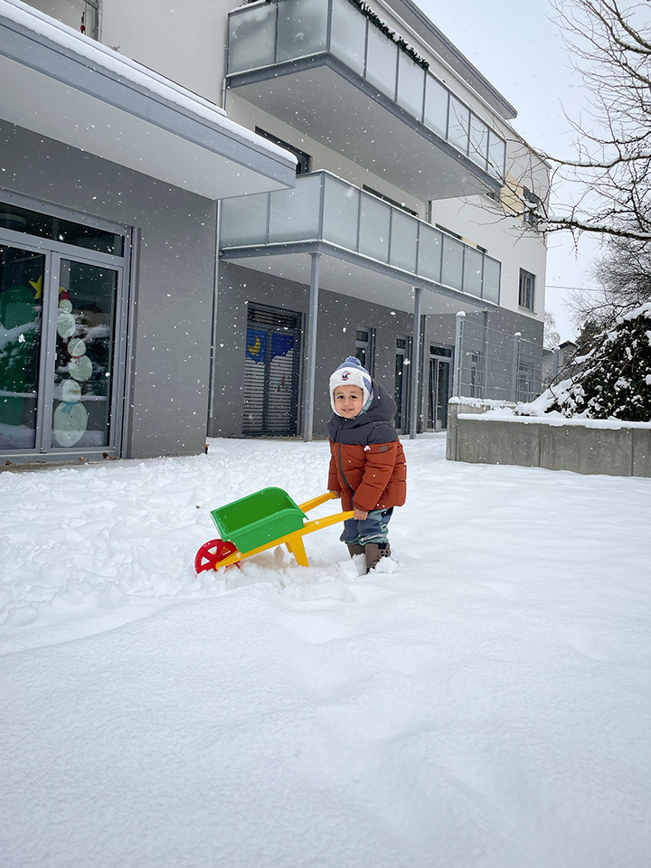 Im Januar konnten wir zum ersten Mal unser Außengelände im Schnee nutzen. Diese Gelegenheit haben wir natürlich sofort ergriffen und gemeinsam mit den Kindern einen Schneemann gebaut. Alle hatten dabei sehr viel Spaß und Freude und genossen die winterliche Zeit draußen.