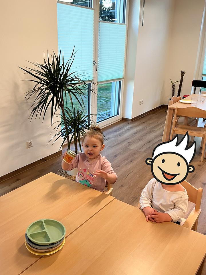 Die Räume sind hell und frisch eingerichtet. Im Flur herrscht eine Willkommensatmosphäre mit der Einladung zum Gespräch. Im vorderen Bereich sind Abstellplätze für Kinderwägen vorgehalten. Die Garderoben der Kinder sind im vorderen Bereich und nach rechts zu den Gruppenbereichen hin. In den Gruppen bestehen die Zugänge zu den Ruhe- und Schlafbereichen. Die Sanitärbereiche befinden sich geradeaus vom Flur abgehend, genügend Wickelbereiche und Toiletten für alle Altersbereiche und auch für unser Team wunderbare Bedingungen. Im hinteren Bereich befinden sich die Versorgungsräume und das Bistro – es handelt sich um einen offenen Bereich mit Sicht auf die Tischgruppen und Anrichte. Wir bereiten hier das Essen vor und haben die Lagerbereiche direkt neben der Küche. Abrundend befindet sich ein Bewegungs- oder Intensivraum direkt in der Nähe.