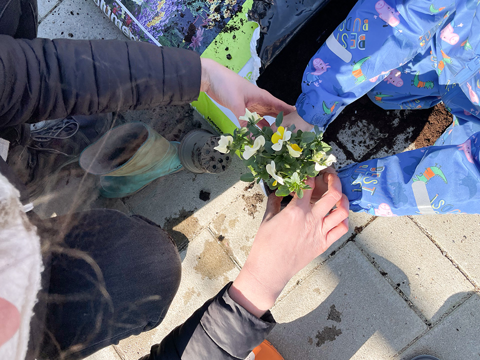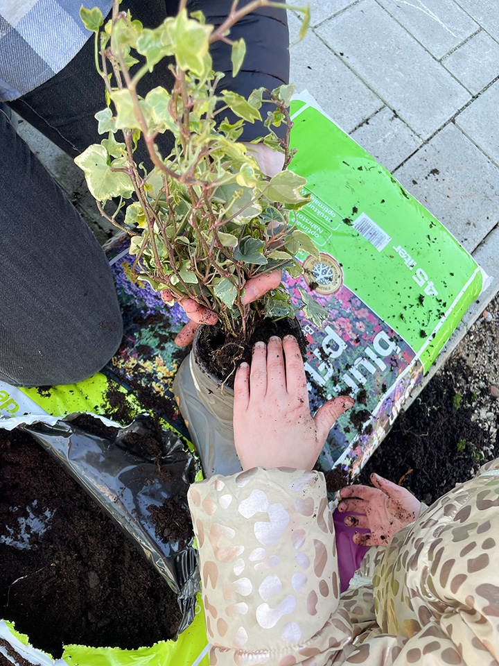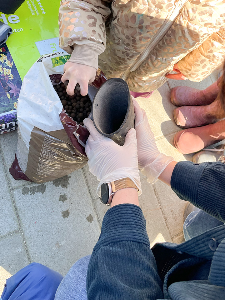 Gemeinsam mit den Kindern haben wir Hornveilchen und Efeu in ausrangierte Gummistiefel gepflanzt. Zuerst wurden Löcher in die Sohlen gebohrt, dann kam Blähton hinein, anschließend Erde und schließlich die Pflanzen. Zum Schluss wurden sie mit der Gießkanne gegossen und mit Haken am Zaun befestigt.